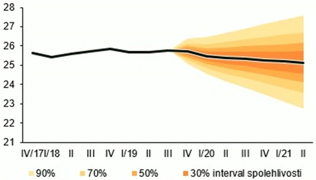 Zároveň banka v nové prognóze očekává slabší korunu. Průměrný kurz koruny letos bude podle nové prognózy 25,70 EUR/CZK, příští rok by koruna měla posílit na průměrných 25,40 EUR/CZK. V předchozí prognóze centrální banka odhadovala pro letošní rok průměrný kurz 25,50 EUR/CZK a pro příští rok 24,90 EUR/CZK. V roce 2021 by měl být podle ČNB průměrný kurz 25,10 EUR/CZK.