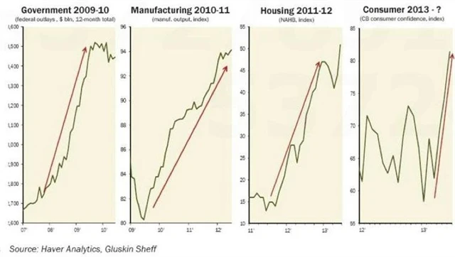 David Rosenberg z Gluskin Sheff níže uvedeným ilustruje probíhající ekonomické oživení v USA po poslední recesi. Nejdříve ekonomiku podporovala vláda, následně průmysl a realitní trh. Čtvrtí na řadě mají být spotřebitelé.