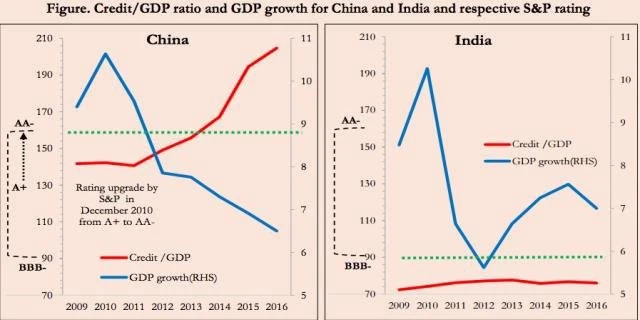Subramanian, jehož cituje server Quartz.com, vychází z toho, že důležitější než běžná měřítka HDP na hlavu a výše rozpočtového schodku je poměr dluhu a HDP. V něm je Indie podstatně stabilnější než například Čína. Její ratingy BBB- a Baa3 jsou přitom na samém chvostu investičního pásma, zatímco třeba agentura Standard & Poor's naopak Číně již před lety dopřávala lepšího hodnocení A+ a v prosinci 2010 je ještě vylepšila na AA-.