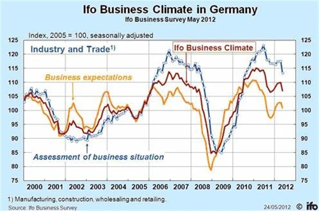Index Ifo zkoumá náladu mezi více než 7 000 německými podniky. Jak ukázala květnová data, firmy se připravují na recesi. Index měřící aktuální situaci (assessment of business situation) se nachází výrazně výše než index měřící očekávání podnikatelů do nadcházejících šesti měsíců (business expectations).