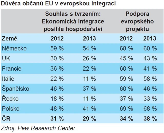 Tvrzení, že ekonomická integrace posílila hospodářství, považuje za pravdivé výrazně méně lidí, než kolik jich bylo v průzkumu z roku 2012. Stejně tak všude kromě ČR klesla podpora evropského projektu. I tak je ale česká podpora EU nejnižší (38 %). Největší propad přitom zaznamenala Francie (téměř o 20 %).
