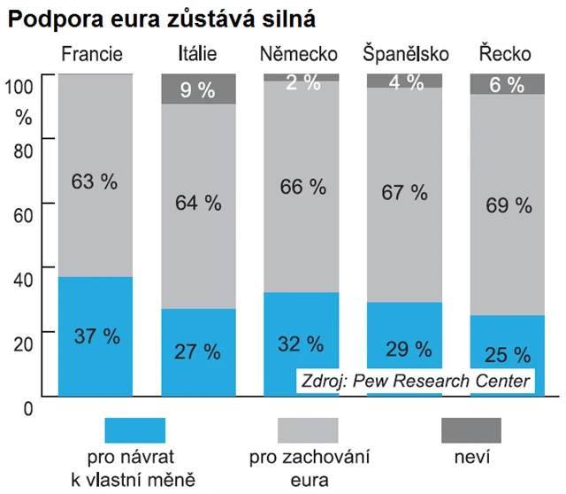 Přestože podpora evropské integrace jako celku klesá, důvěra v euro zůstává vysoká, přestože se často hovoří právě o "krizi eura". Zachovat společnou měnu si nadále přeje skoro 70 % Řeků i Španělů a jen o něco méně Němců, Italů a Francouzů.