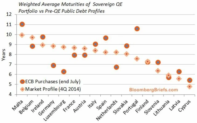 Cílem ECB v rámci kvantitativního uvolňování (QE) bylo nakupovat zhruba průměrnou splatnost dluhopisů v jednotlivých zemích, aby nevytvářela distorze na trhu. Daří se jí to na úrovni celé eurozóny, ale ne ve všech zemích.