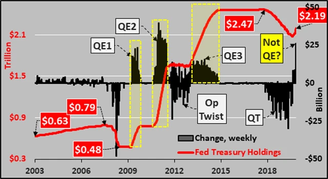 Na prvním grafu je objem státních dluhopisů držených centrální bankou (červená linie, v bilionech USD) a týdenní změny (černé sloupce, v miliardách) v průběhu tří kol kvantitativního uvolňování (QE), Operace Twist a kvantitativního utahování (QT). Kroky Fedu mohou působit vtipně, objemy ale vtipné vůbec nejsou.
