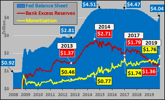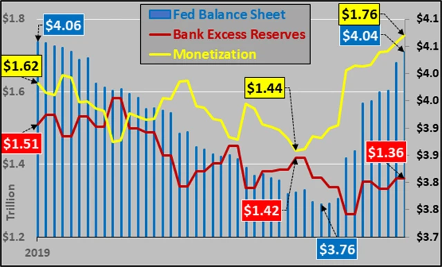 Důkladnější obrázek ukazuje celkovou rozvahu Fedu (modrá plocha), přebytečné rezervy bank (červená linie) a rozdíl mezi rozvahou Fedu a těmito přebytečnými rezervami, který je označen jako monetizace. Fed tedy začal s nákupy aktiv, nové peníze však neoznačil jako v minulosti jako rezervy, ale lije je přímo do aktiv. Monetární heroin by se tomu dalo říkat.