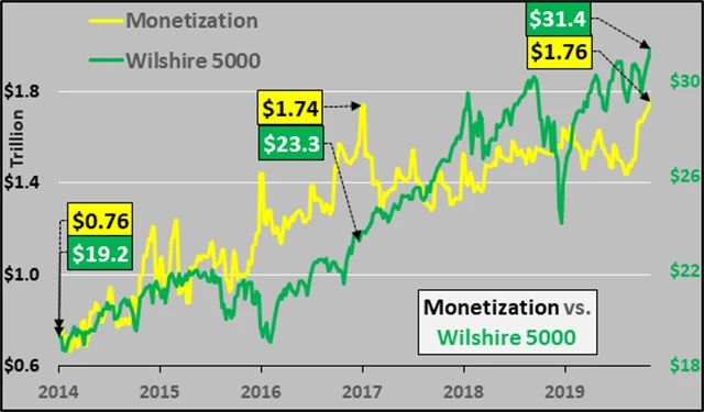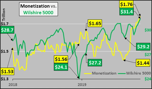 Na dalším grafu je znázorněna zmiňovaná monetizace (žlutá linie) a vývoj indexu Wilshire 5000 (zelená linie), který představuje tržní hodnotu téměř všech veřejně obchodovaných akcií v USA.