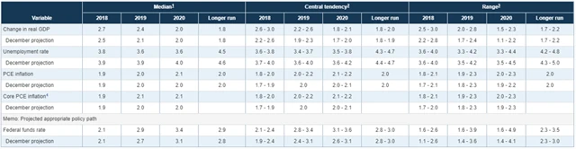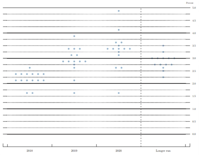 Fed podle březnové prognózy nadále očekává v letošním roce trojí zvýšení úrokových sazeb po 25 bazických bodech. Výhled základní úrokové sazby pro příští rok banka zvýšila na 2,9 % z prosincových 2,7 % a výhled pro rok 2020 upravila na 3,4 % z prosincových 3,1 %. Výhled pro delší období počítá s úrokovou sazbou na úrovni 2,9 % (prosincová prognóza: 2,8 %).