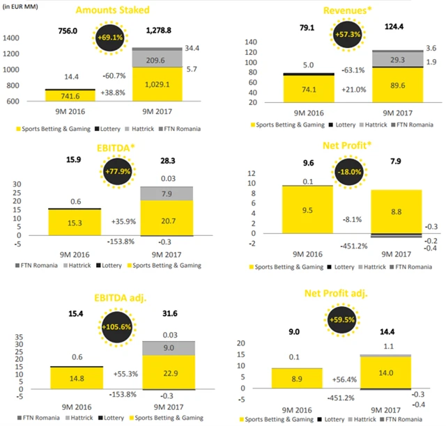 Celková hodnota hrubých výher vzrostla v prvních devíti měsících roku meziročně o 54,1 % na 185,3 milionu eur, provozní zisk EBITDA stoupl o 77,9 % na 28,3 milionu eur a čistý zisk společnosti dosáhl 7,9 milionu eur, meziročně o 18 % méně.