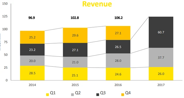 Fortuna - vývoj tržeb v jednotlivých čtvrtletích od roku 2014