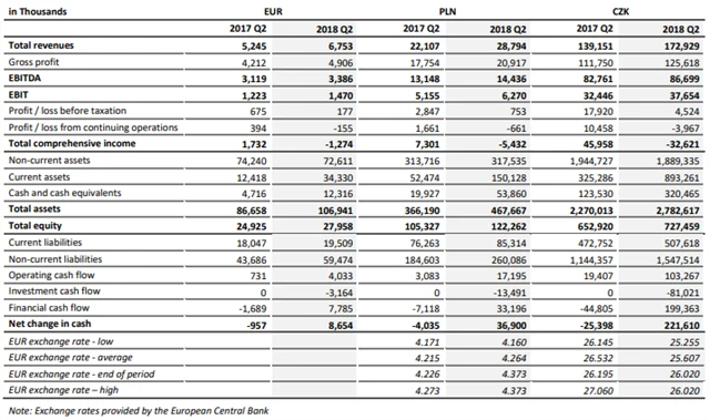 Na úrovni provozního zisku EBIT firma vykázala výsledek 1,47 milionu eur po 1,22 milionu eur v loňském druhém kvartálu. Na úrovni zisku před zdaněním firma vykázala výsledek 177 tisíc eur po loňském zisku 675 tisíc eur. Ztráta z pokračujících operací činila ve druhém čtvrtletí 155 tisíc eur, loni společnost za období od dubna do června vykázala zisk 394 tisíc eur.