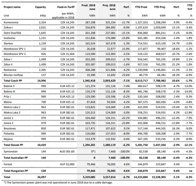 Fotovoltaické elektrárny ovládané přímo či nepřímo společností Photon Energy se souhrnným výkonem 26,097 MWp (výkon solárních panelů v bodě maximálního využití za standardních podmínek) do sítě v prvním pololetí dodaly 14,22 GWh elektrické energie. Meziročně se tak produkce snížila o 4,3 %, byla však 5,1 % nad odhadem firmy.