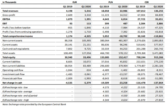 Na úrovni provozního zisku EBIT firma vykázala za první kvartál výsledek 113 tisíc eur po 93 tisících eur o rok dříve. Na úrovni zisku před zdaněním vykázala společnost záporný výsledek 1,85 milionu eur po loňské ztrátě 955 tisíc eur. Čistá ztráta za letošní první čtvrtletí dosáhla 1,71 milionu eur, loni firma vykázala za první tři měsíce roku ztrátu 1,28 milionu eur.