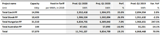 Fotovoltaické elektrárny ovládané přímo či nepřímo společností Photon Energy se souhrnným výkonem 57,08 MWp (výkon solárních panelů v bodě maximálního využití za standardních podmínek) do sítě v prvním čtvrtletí dodaly 11,74 GWh elektrické energie. Meziročně tak produkce vyskočila o 70,9 % a byla více než 19 % nad odhadem firmy.