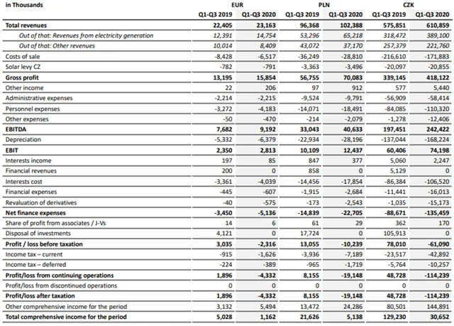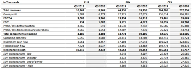 Za prvních devět měsíců roku společnost vykázala tržby 23,16 milionu eur (9M2019: 22,41 milionu eur), provozní zisk EBITDA 9,19 milionu eur (9M2019: 7,68 milionu eur), zisk EBIT 2,81 milionu eur (9M2019: 2,35 milionu eur) a čistou ztrátu 4,33 milionu eur (9M2019: +1,9 milionu eur).