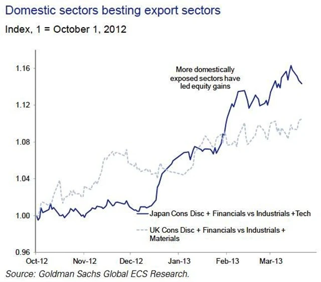 Japonská uvolněná měnová politika není pouze trik ke stimulaci exportně orientovaných odvětví. Trivedi poukazuje na to, že během rally indexu Nikkei 225 v posledních měsících společnosti orientované na domácí trh předčily exportéry, ačkoli slábnoucí jen by měl podporovat export.