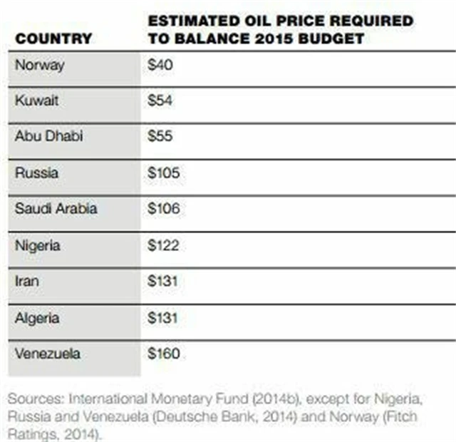 Ambrose Evans-Pritchard v deníku Telegraph na začátku srpna napsal, že při cenách Bretu pod 50 USD za barel je Norsko jedinou významnou "ropnou" zemí, která z příjmů z ropy pokryje rozpočet na rok 2015 tak, aby zůstal vyrovnaný.