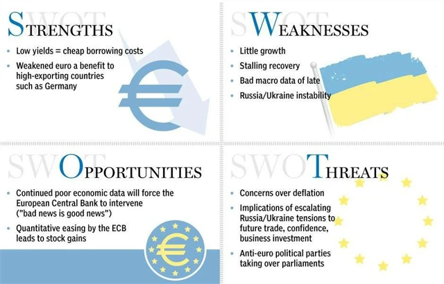 Pomalé oživení členských zemí eurozóny a geopolitická nejistota na Ukrajině odůvodňují opatrnou strategickou expozici na evropských trzích. Financial Post identifikuje silné a slabé stránky měnové unie a příležitosti a hrozby spojené s investováním ve složitém prostředí regionu.