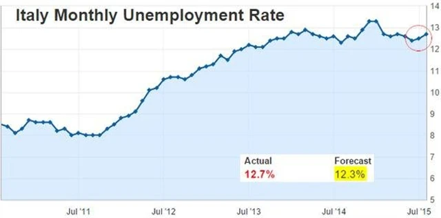 Poslední data z italského trhu práce byla opět zklamáním. Celková míra nezaměstnanosti v červnu vzrostla na 12,7 %, čekalo se 12,3 % po květnových 12,5 %.