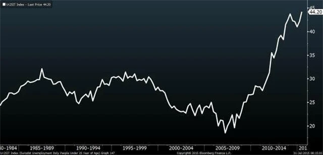Stejně jako v řadě dalších evropských zemí je zásadní nejen vysoká nezaměstnanost celková, ale i míra nezaměstnanosti mladých lidí (do 26 let). Ta je v Itálii zpátky na rekordu.