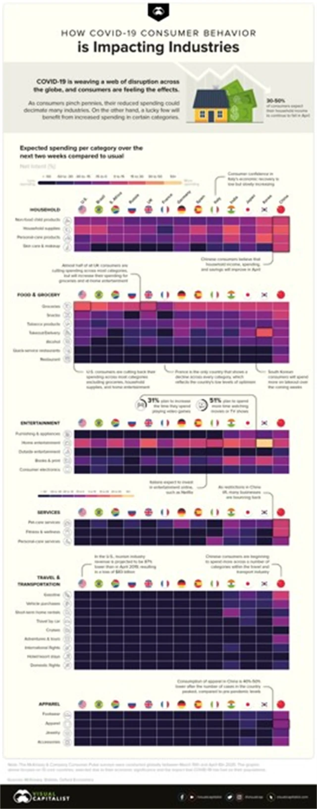 Šíření koronaviru a jím způsobované nemoci covid-19 se odrazilo ve všech sektorech ekonomiky. Ve většině případů přitom výrazně negativně. Nejdramatičtější je situace v segmentu dopravy a cestovního ruchu, růst tržeb naopak zaznamenávají například prodejci potravin či poskytovatelé on-line zábavy. Následující grafika shrnuje očekávání spotřebitelů ohledně výdajů za jednotlivé typy zboží a služeb v nejbližším období.