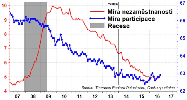 Někdo by se mohl ptát, o čem že to guvernérka mluví. Vždyť celková míra nezaměstnanosti v USA je na 5 %. Yellen mluví o efektu hystereze. Míra nezaměstnanosti je sice na pěti procentech, ale úřady mezi nezaměstnané počítají jen ty, kteří aktivně hledají práci a jsou připraveni do ní nastoupit. Mezi nezaměstnanými nejsou z pohledu statistiky ti, kdo jsou sice bez práce, ale rezignovali na hledání zaměstnání. Raději se vydali cestou invalidity, studia, rodičovské dovolené, důchodu a podobně. Míra participace, která měří míru zapojení (zaměstnaných, ale i nezaměstnaných) lidí na trhu práce, od začátku krize výrazně poklesla.