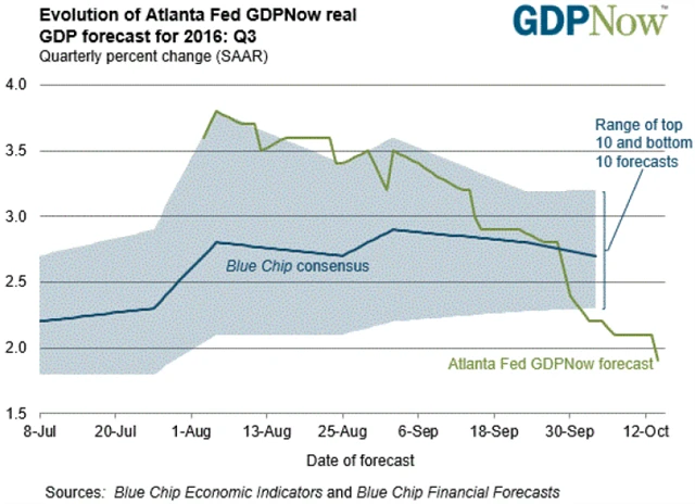 Aktuálně bude dělat vrásky členům Fedu zpomalení ekonomiky. Takzvaný GDPnow, který na základě zveřejněných indikátorů odhaduje růst HDP v daném čtvrtletí, pro třetí kvartál postupně klesl z 3,7 % na 1,9 %. Index podmínek na trhu práce, který sestavuje sám Fed, v září klesl pod nulu poosmé za posledních devět měsíců. I proto bude centrální banka opatrná a sazby bude zvyšovat jen pomalu.