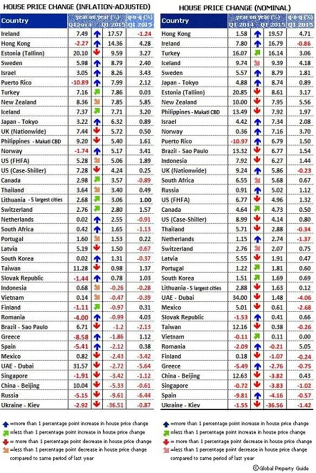 Podle Global Property Guide rostly za první kvartál 2015 ceny domů v 25 z 38 světových nemovitostních trhů, pro které jsou zatím dostupná inflačně očištěná data. Trhů, kde ceny nemovitostí klesaly, nebylo mnoho. Kterých sedm zemí se potýká s nejhlubším poklesem cen domů?