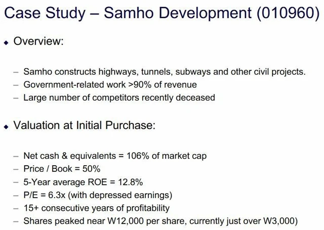 Zajímavou investiční příležitostí mohou podle Hurwitze v současnosti být například akcie jihokorejské společnosti Samho Development, jejímž hlavním předmětem činnosti je stavba dálnic, tunelů a dalších dopravních staveb. Více než 90 % příjmů společnosti pochází z vládních zakázek a nelze opomenout skutečnost, že velké množství konkurenčních podniků v nedávné době ukončilo svoji činnost, čímž se na trhu pro Samho Development vytvořil další prostor k růstu. Firma navíc v posledních více než 15 letech dosahovala stabilního zisku, což by v kombinaci s ukazatelem P/E na nízké úrovni 6,3 mohlo přispět k dalšímu růstu ceny jejích akcií.