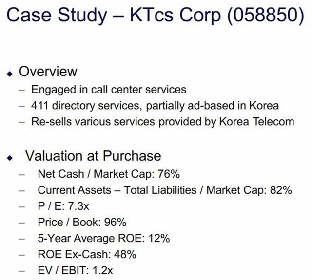 Druhou společností, které by podle něj investoři na jihokorejském trhu měli věnovat zvýšenou pozornost, je provozovatel call center a přeprodejce telekomunikačních služeb KTcs. Ukazatel P/E v tomto případě dosahuje 7,3 a tržní kapitalizace společnosti se pohybuje kolem 96 % její účetní hodnoty.