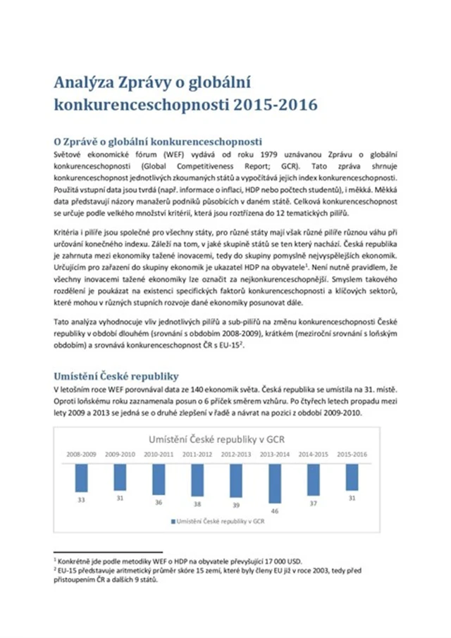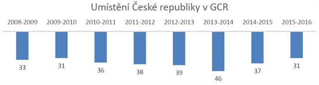 Česká republika se letos v žebříčku globální konkurenceschopnosti umístila na 31. místě ze 140 světových ekonomik. Oproti loňsku zaznamenala posun o 6 příček výše, což představuje druhé významné zlepšení po sobě. Po nejslabším období 2013-2014 se Česko vrátilo na úroveň z let 2009-2010.