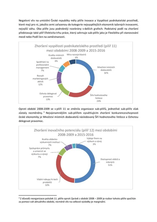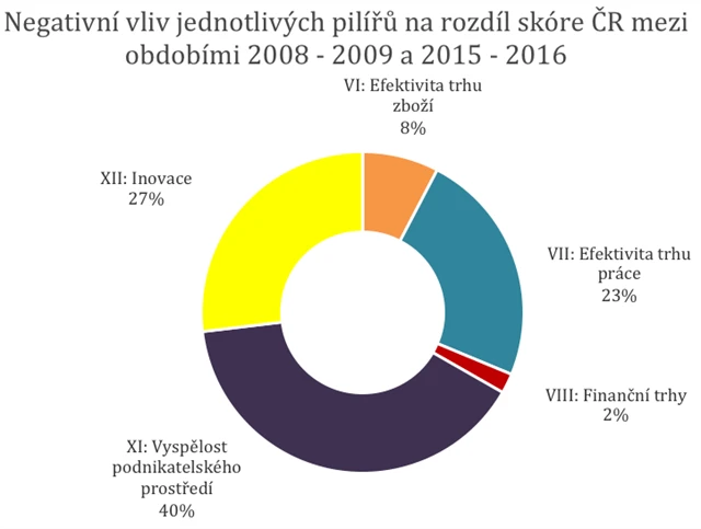 Negativní vliv na umístění ČR měly naopak pilíře Inovace a Vyspělost podnikatelského prostředí, které mají pro Česko, jakožto zemi zařazenou do kategorie nejvyspělejších ekonomik tažených inovacemi, největší váhu. Svou roli sehrál také pilíř Efektivita trhu práce.