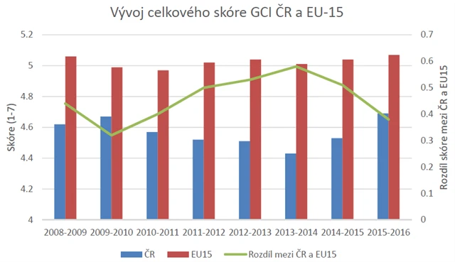 Za průměrem výsledků zemí EU15 Česko stále zaostává, a to především v klíčových pilířích Inovace a Vyspělost podnikatelského prostředí. Menší vliv mají pilíře jako Instituce (ty představují názory na míru korupce a na fungování nejen veřejných institucí, ale také na etiku firem) a Infrastruktura (tam je ČR silná v kvalitě železnic či dodávek elektřiny, méně už v kvalitě silnic a přístavů). Průměr EU15 porážíme v pilířích Makroekonomické prostředí a v kategorii Finanční trhy, kde jsme prokázali relativní stabilitu.