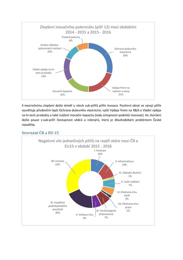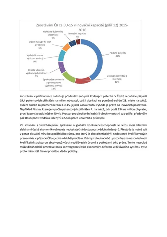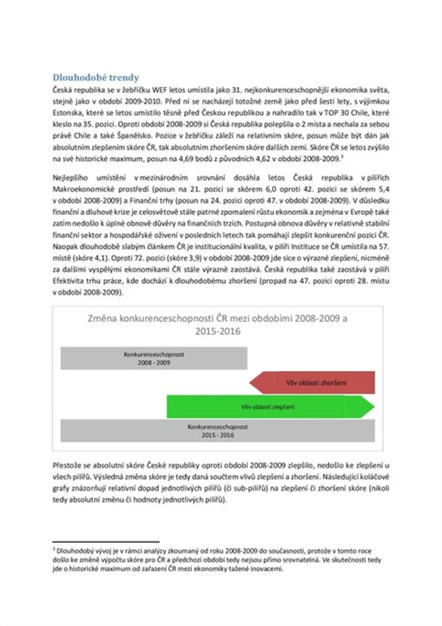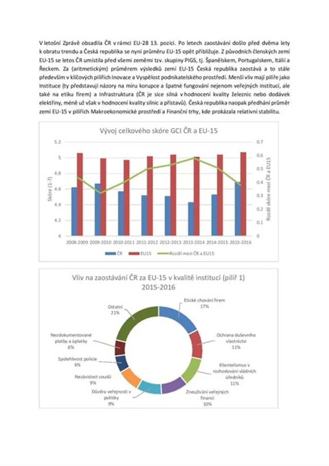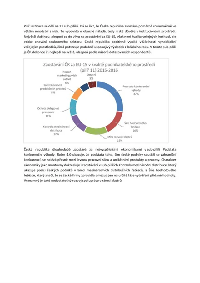 Dobrou zprávou je, že po letech zaostávání došlo navzdory výše uvedeným nedostatkům před dvěma lety k obratu trendu a Česko se nyní k průměru EU15 solidním tempem přibližuje. Negativem je naopak to, že Česká republika dlouhodobě zaostává za nejvyspělejšími ekonomikami v takzvané Podstatě konkurenční výhody. Podstata toho, čím české podniky soutěží se zahraniční konkurencí, se nalézá přesně mezi levnou pracovní silou a unikátními produkty a procesy.