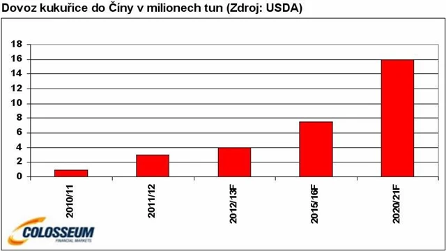 Podle předpovědi společnosti FCStone by nejlidnatější země světa mohla do roku 2015/16 sedminásobně zvýšit import kukuřice na 28 milionů tun. V této sezóně doveze přibližně 4 miliony tun. Podle Ministerstva zemědělství USA by v nejbližší dekádě měla mít Čína až 50% podíl na růstu globálního importu. USDA je oproti FCStone konzervativnější a do roku 2015/16 očekává růst čínského importu na 7,5 milionu tun.