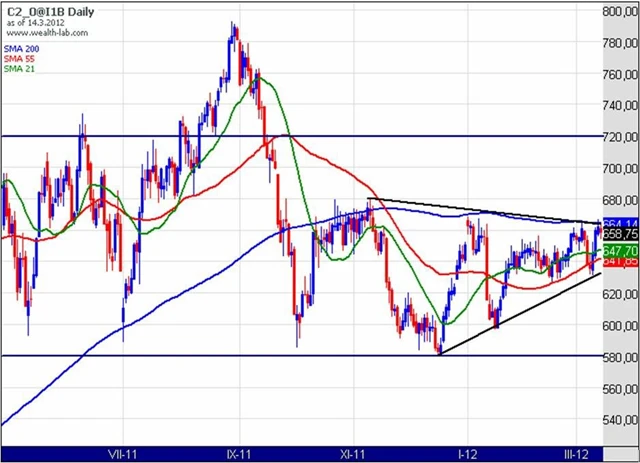 Cena kukuřice se od konce loňského roku pohybuje v konsolidačním trojúhelníku. V současnosti cena testuje jeho horní hranici. Po prolomení této rezistence je možné očekávat pohyb k další rezistenci na úrovni 720 centů za bušl. Krátkodobý 21denní (zelená křivka) a střednědobý 55denní (červená křivka) klouzavý průměr ukazují vzestupný trend. Dolů směřuje jen dlouhodobý 200denní (modrá křivka) klouzavý průměr.
