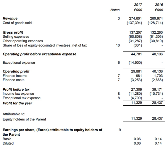 Upravený provozní zisk EBITDA firmě vzrostl o 9,7 % na 56,3 milionu eur, zisk na akcii dosáhl 0,06 eura po 0,14 eura před rokem a upravený zisk na akcii dosáhl 0,16 eura na akcii po 0,14 eura v roce 2016. Tržby skupiny se zvýšily o 5,2 % na 274,6 milionu eur.