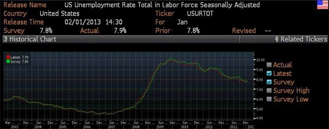 Data z amerického trhu práce byla smíšená až mírně pozitivní. Míra nezaměstnanosti byla horší než očekávaná (7,9 % vs. konsenzus 7,8 %). Změna počtu pracovních míst byla zhruba v souladu s očekáváním (157 tisíc vs. konsenzus 160 tisíc). Optimismus ale vyvolaly lepší revidované údaje za konec roku 2012.