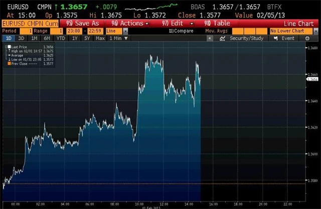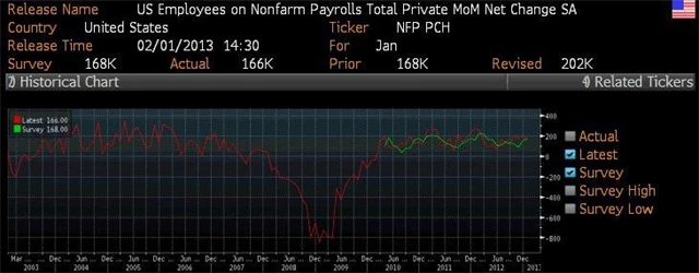 Z USA přišla už ve středu smíšená data: dle ADP vzrostl počet nově vytvořených pracovních míst o 192 tisíc. Naproti tomu HDP za čtvrté čtvrtletí 2012 zklamal masivně – čekal se mezikvartální anualizovaný růst o 1,1 %, nakonec z toho byl pokles o 0,1 %.