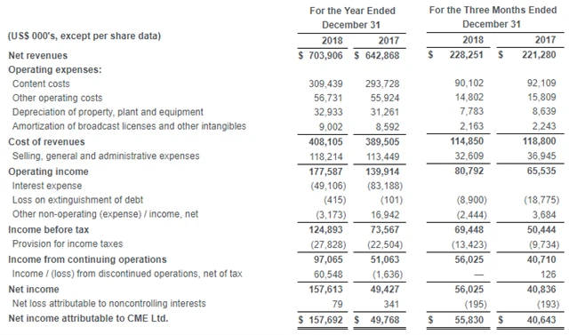 Provozní zisk OIBDA se loni meziročně zvýšil ze 179,77 milionu dolarů na 222,67 milionu dolarů (+23,9 %). Čisté tržby se zvýšily o 9,5 % (bez vlivu změn měnových kurzů o 5,3 %). OIBDA marže stoupla o 3,6 procentního bodu na 31,6 %. Na úrovni zisku z pokračujících operací vykázala firma za loňský rok výsledek 97,07 milionu dolarů, za rok 2017 reportovala CME výsledek 51,06 milionu dolarů.