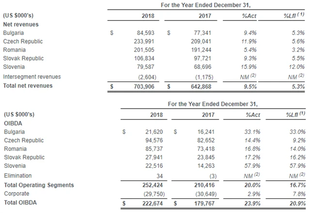 "Zveřejněné výsledky hospodaření za čtvrté čtvrtletí v oblasti ziskovosti překonaly naše odhady a jsou i nad tržním konsenzem. Pouze tržby mírně zaostaly za odhady trhu i těmi našimi. Zveřejněné hospodářské výsledky nově zahrnují slovinské aktivity, a to po lednovém ohlášení upuštění od jejich prodeje. Tržby vzrostly o 3,2 % na 228,3 milionu USD. Napomohl tomu především silnější růst na Slovensku, kde se tržby meziročně zvýšily o 5,4 % na 35,4 milionu USD. Zisk OIBDA vzrostl meziročně o 18,6 %, kdy nejvíce překvapily výkony Slovenska a Rumunska. Ty zaznamenaly zisk OIBDA ve výši 17,9 milionu USD, respektive 27 milionů USD oproti 12,9 milionu USD, respektive 21,6 milionu USD ve srovnatelném období roku 2017. Velkým překvapením je pro nás OIBDA marže, která dosáhla 39,8 % v porovnání s 34,6 % o rok dříve," říká analytik z Komerční banky Jiří Kostka.