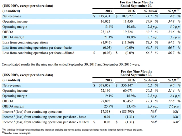 Čisté tržby se CME v třetím čtvrtletí zvýšily meziročně o 11,1 % na 119,43 milionu USD (bez vlivu změn měnových kurzů +4,8 %), OIBDA marže se firmě zvýšila o 3,1 procentního bodu na 21,1 %. Na úrovni zisku/ztráty z pokračujících operací společnost vykázala záporný výsledek 1,95 milionu USD, meziročně se tak její ztráta z pokračujících operací snížila o 83,5 % (bez vlivu FX o 84,5 %). Čistá ztráta CME dosáhla 7,93 milionu USD (3Q2016: 19,63 milionu USD).