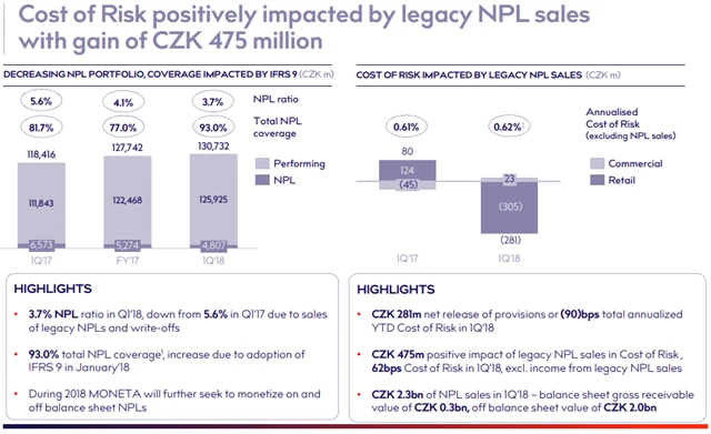 Čistý zisk na úrovni 1,17 miliardy Kč pozitivně ovlivnil pokles opravných položek k poskytnutým úvěrům díky prodeji části portfolia nesplácených úvěrů. Pozitivní saldo činilo 281 milionů Kč a management díky tomuto výsledku zvýšil i odhad pro čistý zisk za celý letošní rok o 100 milionů Kč na minimálně 3,5 miliardy Kč. Provozní náklady Monetě stouply o 8,9 % na 1,26 miliardy Kč.