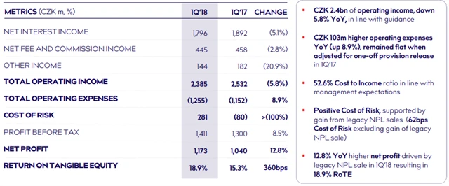 Meziroční nárůst provozních nákladů byl podle banky z velké části způsoben jednorázovým rozpuštěním rezerv v roce 2017. Výši nákladů ovlivnily i příspěvky do fondu pojištění vkladů a fondu na řešení krize. Ukazatel poměru nákladů k výnosům dosáhl v prvním kvartálu 52,6 %.