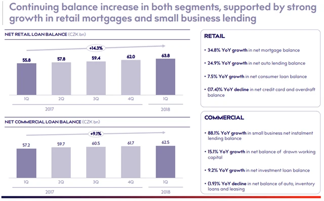 Bilance čistých retailových úvěrů meziročně stoupla z 55,8 miliardy Kč na 63,8 miliardy Kč (+14,3 %), a to mimo jiné díky růstu čistých hypotečních úvěrů z 16,5 miliardy Kč na 22,2 miliardy Kč (+34,8 %). Bilance čistých firemních úvěrů meziročně stoupla z 57,2 miliardy Kč na 62,5 miliardy Kč, z toho objem úvěrů pro malé a střední firmy se zvýšil z 1,37 miliardy Kč na 2,57 miliardy Kč.