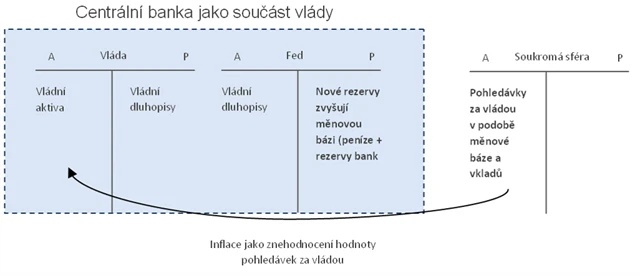 Jelikož vláda skrze centrální banku drží monopol na tvorbu peněz, my, jakožto soukromý sektor, jsme prakticky stále nuceni udržovat svoji pohledávku za vládou (neboť jak jsme uvedli výše, centrální banka drží vládní dluhopisy jako protihodnotu fyzických peněz). Jednostranné navýšení měnové báze (ať už fyzických peněz, či elektronických rezerv) bez zvýšení hodnoty aktiv vlády představuje znehodnocení peněz.