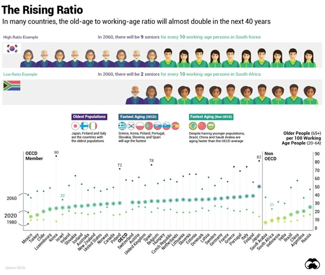 Budou-li pokračovat současné trendy, v roce 2060 v Jižní Koreji bude na deset lidí v produktivním věku připadat devět lidí v důchodovém věku. Podobně na tom budou i Japonsko nebo třeba Španělsko.