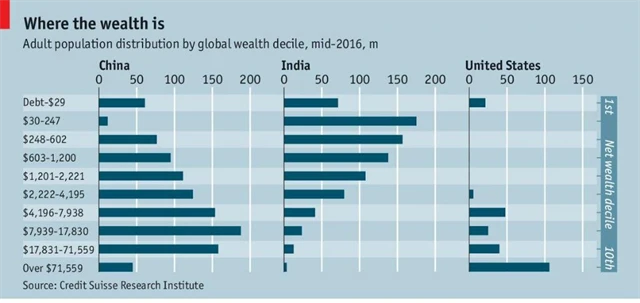 Ve Spojených státech byste s čistým jměním (hodnota finančních úspor, finančních aktiv a nemovitého majetku po odečtení všech dluhů) kolem čtyř tisíc dolarů (zhruba 100 tisíc Kč) patřili k chudině. V Číně byste se stejným jměním byli součástí nižší střední třídy a v Indii byste byli rovnou za boháče.