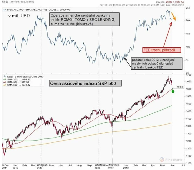 V prvním grafu jsou nahoře zachyceny operace Fedu spočívající v odkupu nebo půjčování amerických dluhopisů investičním bankám, čímž se zvyšuje likvidita trhů. Peníze ale nekončí v ekonomice, jak by si možná Fed přál, ale rovnou v akciích, což je vidět na vývoji akciového indexu S&P 500. Od počátku roku 2013 podporoval Fed trh injekcemi 85 miliard USD měsíčně. Minulý týden Fed poprvé trochu polevil – a hned se to projevilo silnějšími poklesy indexu S&P 500.