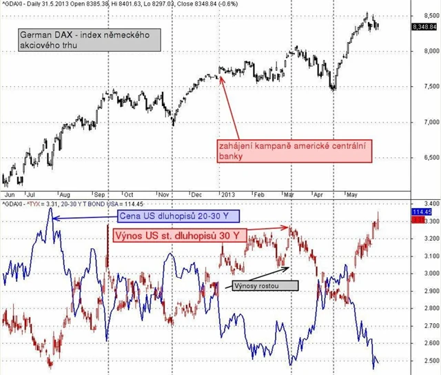 Nejvíce se objevují obavy, že snížení objemu odkupovaných dluhopisů bude v USA znamenat růst výnosů dlouhodobých dluhopisů. Já si to nemyslím, dosavadní vývoj za poslední půlrok ukazoval u amerických státních dluhopisů spíše opak. Vidím jako pravděpodobnější, že by omezení přílivu peněz na kapitálové trhy znamenalo redukci vysoce spekulativních a rizikových obchodů, což si většina nejmocnějších bank nepřeje, protože právě tento současný stav jim umožňuje vydělávat ohromné peníze na obchodech s akciemi. Paradoxně by tak redukce kvantitativního uvolňování mohla vyústit ve vyšší ceny "bezpečných aktiv", jako jsou jsou právě státní dluhopisy nebo zlato.