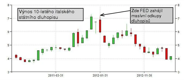 Od začátku roku 2013, kdy Fed zesílil svoji kampaň, výnosy italských státních dluhopisů klesaly. Podobně vypadají grafy vývoje výnosů dalších zemí - Španělska, Řecka, dokonce i České republiky. Z peněz od Fedu byly zřejmě financovány nákupy dluhopisů evropských zemí. Jakmile tento zdroj peněz vyschne, nebude pro cenu dluhopisů jiné cesty než dolů.